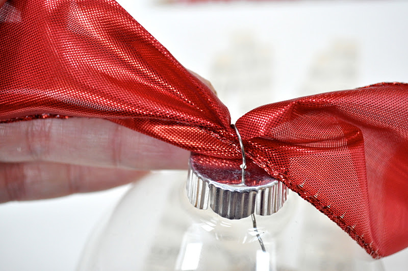 4. Replace the top. Tie a ribbon in a bow in the loop at the top. Tie a loop of thread or twine through the same loop to hang on the tree.